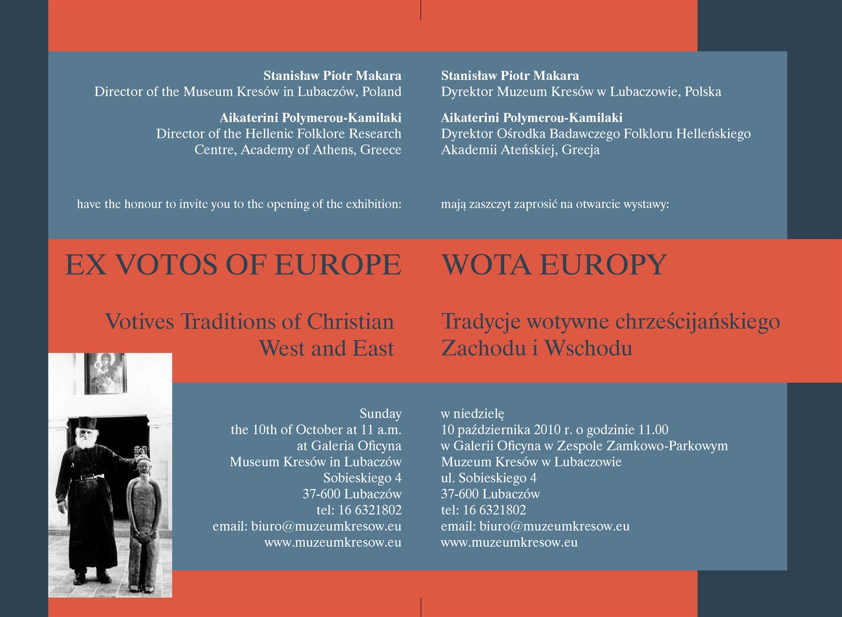 Obraz przedstawiający Muzeum Kresów zaprasza na "Wota Europy"„WOTA EUROPY. Tradycje wotywne chrześcijańskiego Zachodu i Wschodu” – to tytuł najnowszej międzynarodowej wystawy na otwarcie której w niedzielę 10. października zaprasza Muzeum Kresów w Lubaczowie. Wystawa stworzona przy współpracy ze Ośrodkiem Badawczym Folkloru Helleńskiego Akademii Ateńskiej z Grecji ukazuję bogatą tradycję składania wotów.