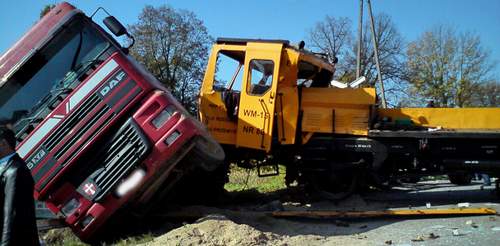 Do wypadku w Oleszycach doszło około godz. 10 rano. Na niestrzeżonym przejeździe kolejowym drezyna uderzyła w samochód ciężarowy DAF. Cztery osoby trafiły do szpitala. Według wstępnych ustaleń policji do wypadku doszło z winy kierowcy ciężarówki, który nie zachował ostrożności na niestrzeżonym przejeździe kolejowym.