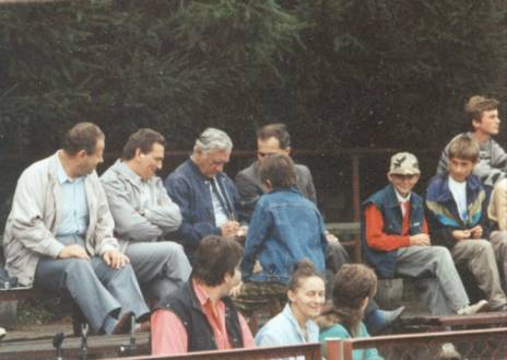 Poniżej fotografia z jednego z pobytów Kazimierza Górskiego na stadionie w Lubaczowie. Na trybunach Kazimierz Górski obok ks. Józefa Dudka. (fot. Parafialny Klub Sportowy Metanoja Lipsko)