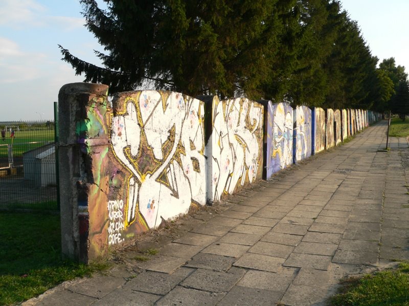 Nie wszystkie graffiti na murze są ciekawe, były duzo lepsze i były dużo gorsze, ale bądź co bądź lepiej zrobić ładny „murek’ dla grafficiarzy, którzy mogą postarać się o coś naprawdę ładnego, a nie zwykła, badziewna do tego oczywiscie zielona siatka. Nie dość, że boisko tandetne to i ogrodzenie takie będzie… Ale co zrobić… „budujmy kawiarenki”, „niszczmy parki” (rynek), „nie kopmy studni głębinowej (bo przeciez mieszkancy wyzszych pieter w blokach zawsze maja wode w lecie, prawda?)”co za kraj,,