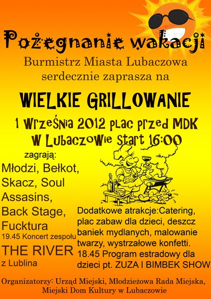 Burmistrz Miasta Lubaczowa, Młodzieżowa Rada Miasta i Miejski Dom Kultury zapraszają w sobotę (01.09) na imprezę pod nazwą „Pożegnanie wakacji”. Na placu przed MDK w Lubaczowie m.in, wielkie grillowanie, sporo atrakcji dla dzieci, koncerty miejscowych zespołów oraz gwiazdy wieczoru – zespołu bluesowego „The River” z Lublina.