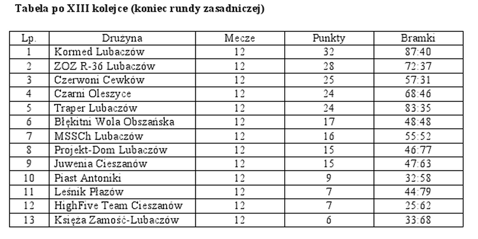 Trzynaście zespołów grających w rozgrywkach Halowej Ligi Piłki Noznej w Cieszanowie obecnego sezonu zakończyło właśnie rundę zasadniczą rozgrywek. Osiem najlepszych drużyn zagra w rundzie play-off. O tym kto zostanie mistrzem ligi zadecydują mecze finałowe, które już w najbliższy weekend.
