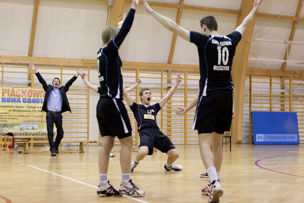 Sobotnie spotkanie, z niepokonanym dotąd zespołem z Sędziszowa, ściągnęło do hali przy ulicy Krótkiej prawie pół tysiąca kibiców. Miejscowi siatkarze słabo jednak rozpoczęli pojedynek i przegrali pierwszego seta do 22. Czarni w tej partii popełniali sporo błędów w obronie i nie potrafili skutecznie zatrzymać przeciwnika na siatce. Męska rozmowa przed kolejną odsłoną przyniosła efekt, bo zawodnicy z Oleszyc znacząco poprawili swoją grę i doprowadzili do remisu. W trzecim secie wyrównana walka trwała do samego końca, a decydującym momentem było przyznanie żółtej kartki jednemu z zawodników gości przy stanie 21:22. Dodatkowy punkt dał miejscowym minimalną przewagę, którą doskonale wykorzystali wygrywając ostatecznie seta 28:26. Ostatni set to pełna dominacja gospodarzy, którzy po nieco ponad 1,5-godzinnym meczu mogli cieszyć się ze zwycięstwa.