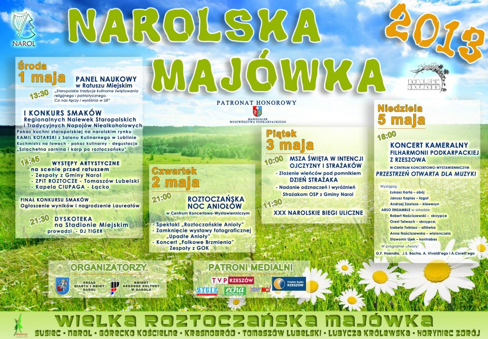 Pierwszego dnia imprezy wystąpią zespoły muzyczne: „S-Flores”, Zespół Pieśni i Tańca Roztocze z Tomaszowa Lubelskiego, zespół folkowy „Ciupaga”. Występy na stadionie w Narolu rozpoczną się o godz. 14.45. W programie też pokaz kulinarny oraz rozstrzygnięcie konkursu smaków regionalnych nalewek staropolskich i tradycyjnych napojów niealkoholowych.Dzień później w Centrum Koncertowo-Wystawienniczym o godz. 21 zobaczymy spektakl „Roztoczańskie Anioły” oraz koncert „Folkowe Brzmienia”.3 maja będzie dniem strażackim. Strażacy otrzymają odznaczenia i wyróżnienia. O godz. 11.30 wystartują także jubileuszowe XXX Narolskie Biegi Uliczne.Zaś w niedzielę, 5 maja, o godz. 18 w Centrum Koncertowo-Wystawienniczym koncert kameralny Filharmonii Podkarpackiej z Rzeszowa.Od 1 do 4 maja Roztoczańskie Kino Objazdowe zawita do różnych miejscowości. Wieczorne seanse pod gołym niebem zaplanowano w Horyńcu Zdrój (1 maja, Zajazd Hubertus, godz. 19), Tomaszowie Lubelskim (2 maja, plac przy Tomaszowskim Domu Kultury, godz. 20), Narolu (3 maja, Restauracja Sakra, godz. 20) i Gorajcu (4 maja, Chutor Gorajec k. Cieszanowa, godz. 19). W trakcie pokazów zostanie zaprezentowanych kilkanaście filmów dokumentalnych związanych z Roztoczem o tematyce etnograficznej, regionalnej i historycznej.