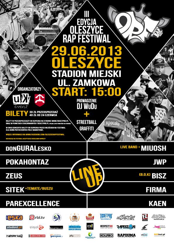 Oleszyce Rap Festiwal to impreza, która z roku na rok cieszy się coraz większym zainteresowaniem wśród publiczności. Do Oleszyc zapowiadają przyjazd ludzie z całej Polski! W tym roku na scenie mają pojawić się m.in.: Bisz, donGURALesko, JWP, Kaen, Miuosh, ParExcellence, Pokahontaz, Sitek, Zeus oraz supporty. Szczegóły na poniższym plakacie i oficjalnym fanpage festiwalu: www.fb.com/oleszycerapfestiwal