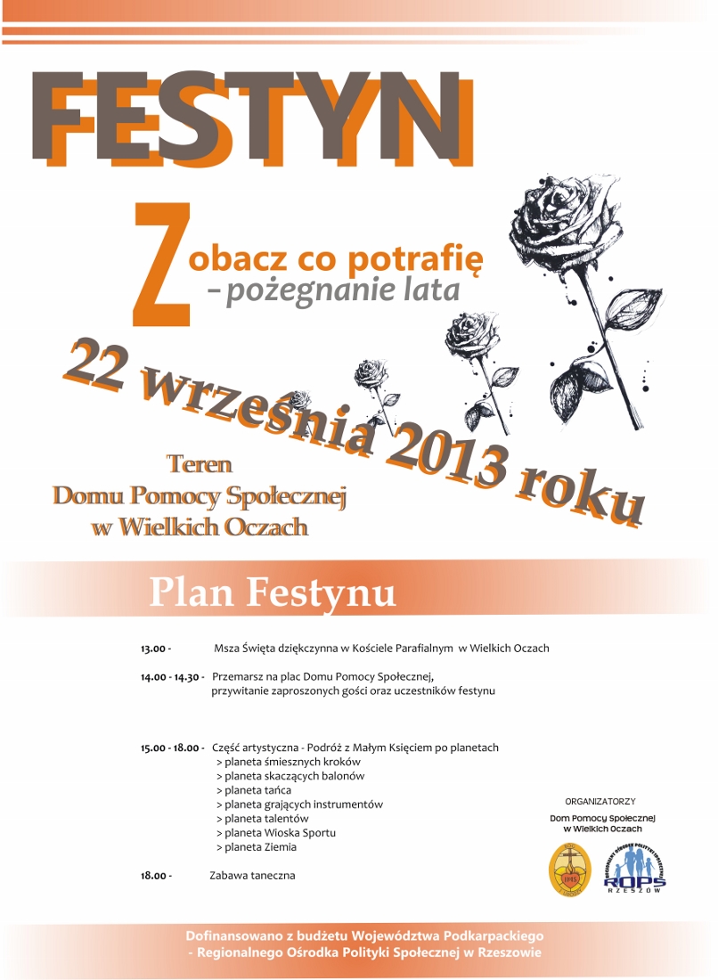Dom Pomocy Społecznej w Wielkich Oczach ma zaszczyt serdecznie zaprosić wszystkich chętnych na Festyn pn. „Zobacz co potrafię – pożegnanie lata”, który odbędzie się dnia 22 września 2013 roku (niedziela) przy Zespole Szkół w Wielkich Oczach, ul. Leśna.