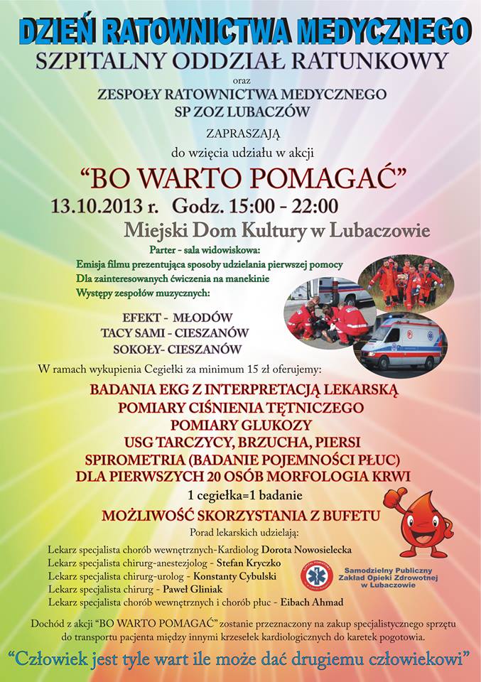 Szpitalny Oddział Ratunkowy oraz Zespoły Ratownictwa Medycznego SP ZOZ Lubaczów zapraszają w najbliższą niedzielę (13.10) do wzięcia udziału w akcji „Bo warto pomagać”. Dochód zostanie przeznaczony m.in. na zakup specjalistycznego sprzętu do transportu pacjentów w karetkach, w tym krzesełek kardiologicznych.