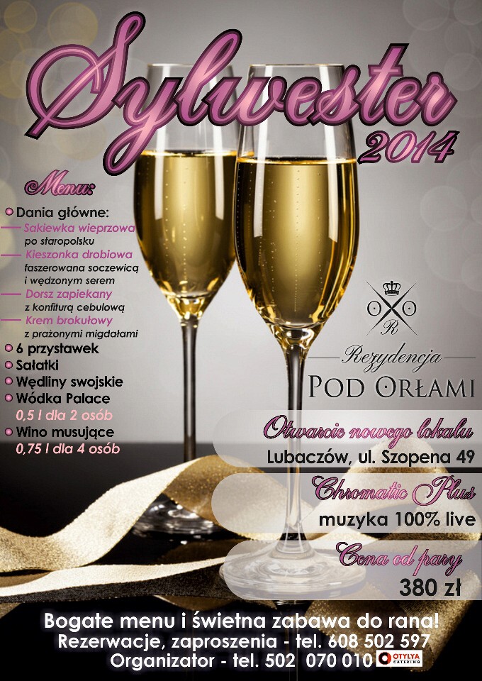 – Sylwester to nasza inauguracyjna impreza w Rezydencji i z tej okazji chcemy w atrakcyjnej cenie przygotować coś wyjątkowego – mówi Hubert Hołowaty z firmy Otylya Catering, która zarządza lokalem. W sylwestrowym menu znalazła się m.in. sakiewka wieprzowa po staropolsku, kieszonka drobiowa faszerowana soczewicą i wędzonym serem, czy dorsz zapiekany z konfiturą cebulową, Będzie też sporo przystawek, sałatki, swojskie wędliny i alkohol. Nie zabraknie oczywiście również muzyki na żywo. Wszystko w cenie 380 zł od pary – dodaje H, Hołowaty.