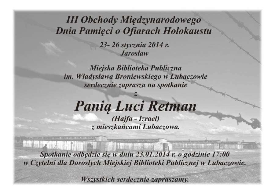 W ramach III Obchodów Międzynarodowego Dnia Pamięci o Ofiarach Holokaustu w Miejskiej Bibliotece Publicznej w Lubaczowie odbędzie się dziś (23.01) spotkanie z Lucią Retman, którą przeżyła Holokaust dzięki rodzinie Pomorskich z Lubaczowa.