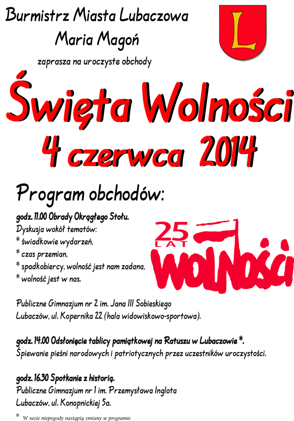 Dziś mija 25 lat od pierwszych częściowo wolnych wyborów zakończonych zwycięstwem Solidarności. Ich konsekwencją był upadek rządów komunistycznych w Polsce. Z tej okazji burmistrz Lubaczowa zaprasza na uroczyste obchody Święta Wolności. Szczegóły na plakacie.