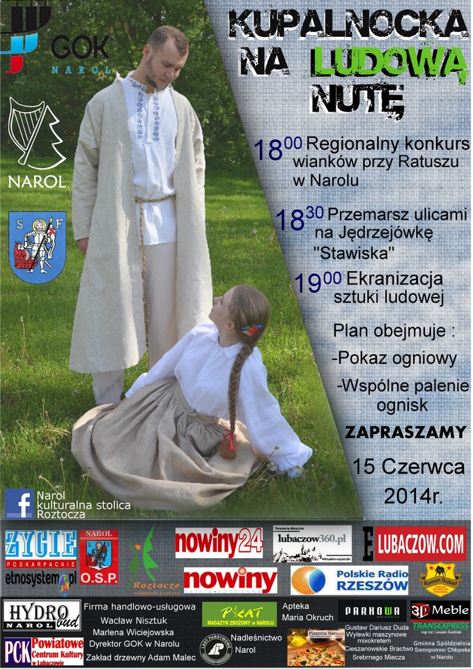 Na magiczny wieczór, pełen muzyki, ognia i czarów zaprasza Gminny Ośrodek Kultury w Narolu. Słowiańskie święto ognia, wody, urodzaju, miłości i radości rozpocznie się konkursem wianków przy Ratuszu. Dalsza część imprez, w trakcie której przewidziano m.in. ekranizację sztuki ludowej i pokaz ogniowy odbędzie się na „Stawiskach”. Szczegóły na plakacie.