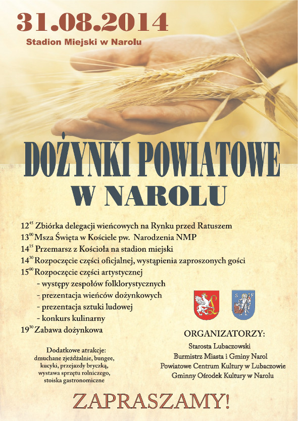W niedzielę (31.08) na Stadionie Miejskim w Narolu odbędą się Dożynki Powiatowe. Jest to święto rolników, podczas którego, jak nakazuje tradycja, podziękują za tegoroczne żniwa. Później podczas zabawy będą cieszyć się z zebranych plonów.