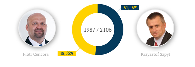 Według informacji zawartych na stronie internetowej Państwowej Komisji Wyborczej, Krzysztof Szpyt wygrał drugą turę wyborów na burmistrza Lubaczowa. Swojego konkurenta Piotra Cencorę pokonał 119 głosami.
