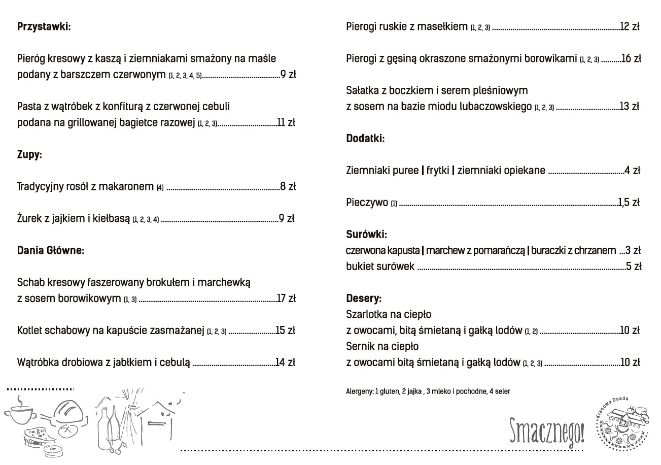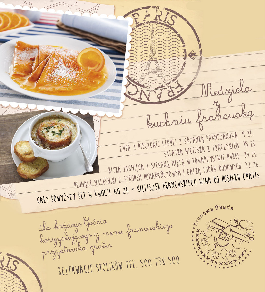 Kulinarne wędrówki tematyczne to cykl spotkań z przysmakami z różnych zakątków świata, na które już po raz drugi zaprasza Andrzej Wegierak, szef kuchni w Kresowej Osadzie. Tegoroczną wędrówkę goście restauracji rozpocząć mogą z kuchnią francuską. W towarzystwie utworów Édith Piaf posmakować będzie można m.in. bitki jagnięcej z siekaną miętą czy też płonących naleśników z syropem pomarańczowym i gałką lodów domowych. Dla chętnych nie zabraknie także francuskiego wina.