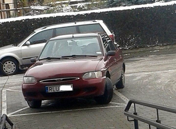 Kierowca bordowego forda escorta tak spieszył się na zakupy, że zaparkował przy samym wejściu do obiektu, prawie na samym środku znaku zakazu. Zdjęcie wykonano przy sklepie Niwex w Lubaczowie.