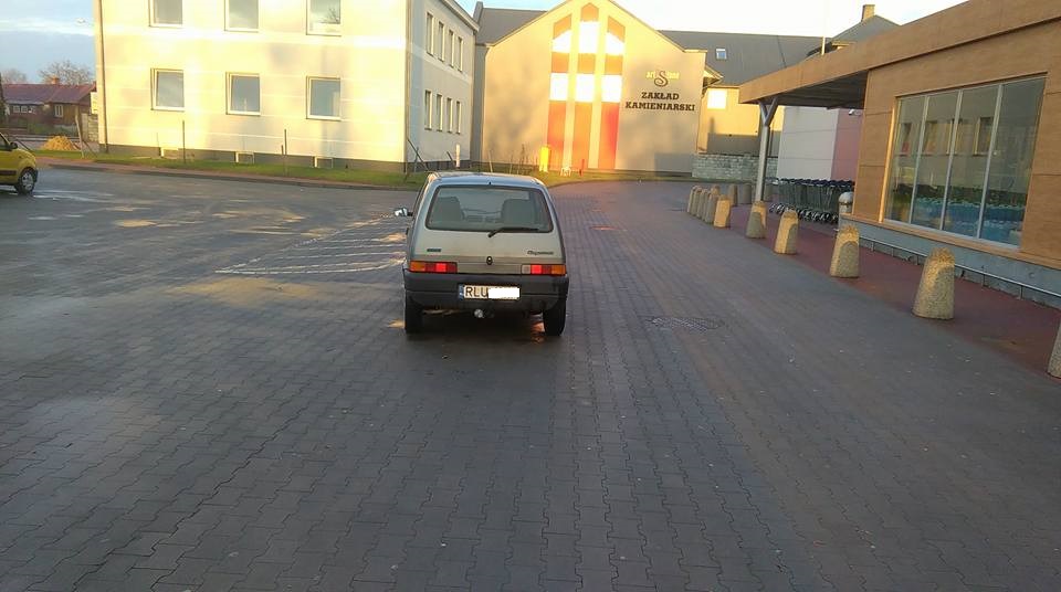 „Zapomniany” fiat cinquecento pod sklepem Tesco w Lubaczowie z pewnością nie stoi we właściwym miejscu.