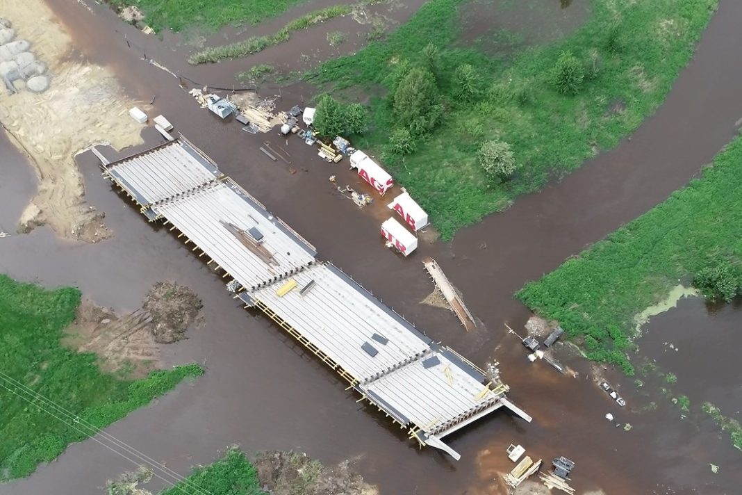 Obfite opady deszczu w ostatnich dniach sprawiły, że znacząco podniosły się stany rzek w regionie, a część z nich wystąpiły z brzegów. Doskonale widać to na zdjęciach pokazujących budowany obecnie odcinek obwodnicy naszego miasta pomiędzy osiedlem Mazury II a ul. Sportową.