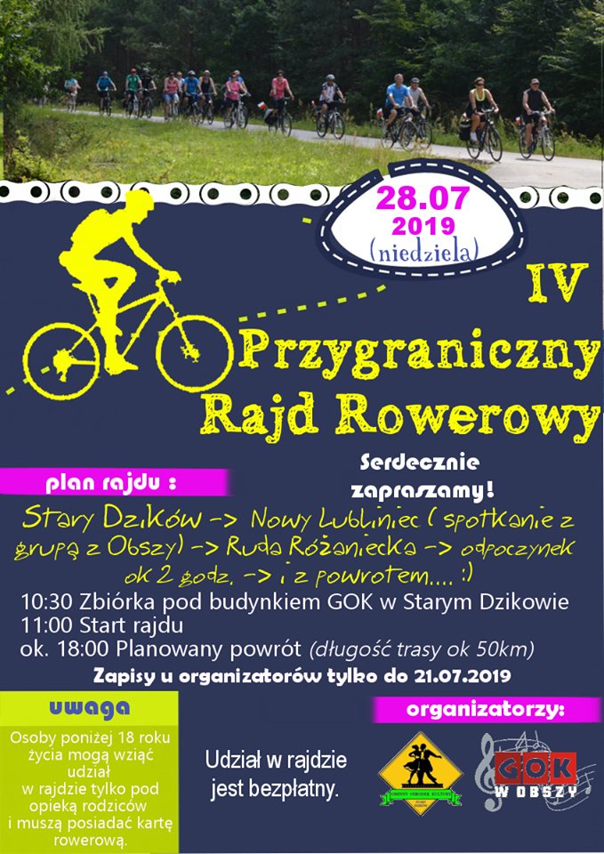 Tegoroczna odsłona Przygranicznego Rajdu Rowerowego poprowadzi jego uczestników ze Starego Dzikowa do Rudy Różanieckiej i z powrotem. Po drodze do cyklistów w Nowym Lublińcu dołączy się zaprzyjaźniona grupa z gminy Obsza. Miejscem docelowym rajdu jest Ruda Różaniecka. Tam zaplanowano około dwugodzinny odpoczynek. W sumie do pokonania będzie 50 km.