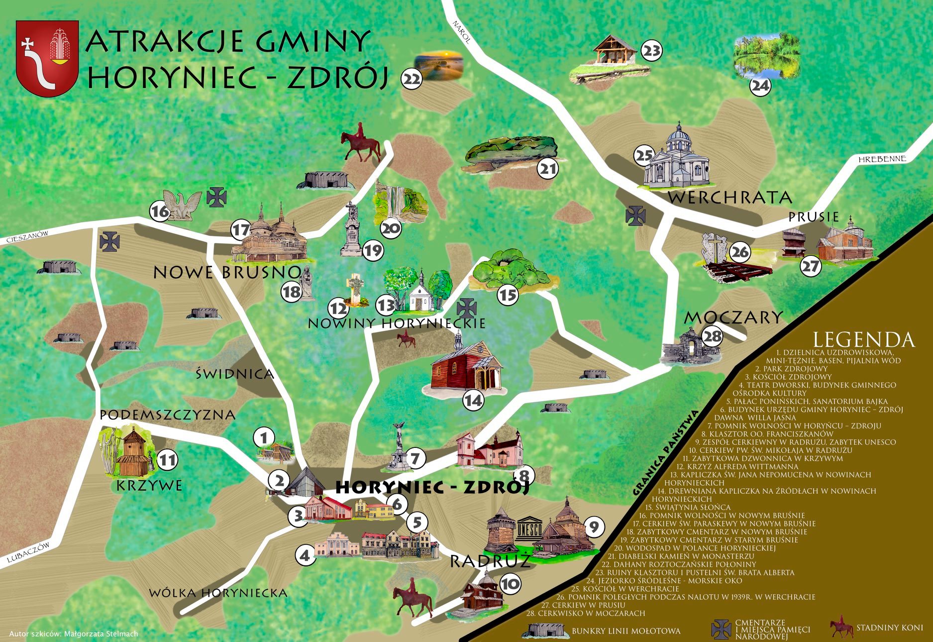 Mapa ma charakter poglądowy i dlatego do odwiedzenia niektórych miejsc warto zabrać ze sobą klasyczną mapę turystyczną lub posiadać nawigację GPS. Szkice do mapki wykonała lokalna artystka Małgorzata Stelmach, córka Janusza Burka. W formie papierowej mapa będzie także dostępna do końca miesiąca w Punktach Informacji Turystycznej w Horyńcu-Zdroju.