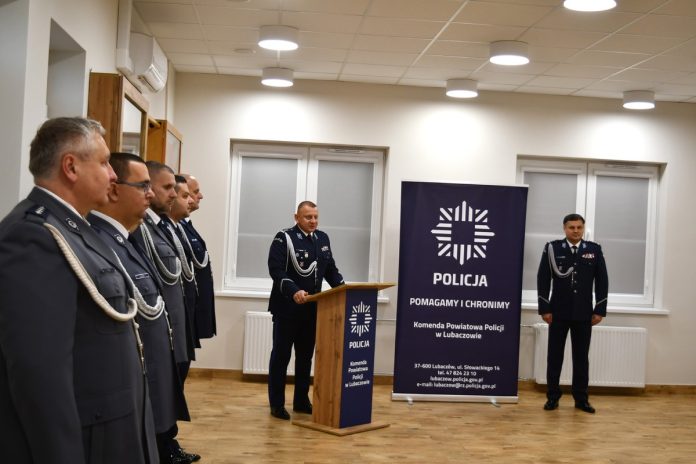 Awansowani funkcjonariusze, którzy zdobyli pierwszy stopień aspirancki – młodszego aspiranta, otrzymali akty mianowania z rąk Komendanta Powiatowego Policji w Lubaczowie, mł. insp. Artura Wasiuty. W ceremonii wzięli udział także I Zastępca Komendanta Powiatowego Policji mł. insp. Krzysztof Farion oraz kadra kierownicza jednostki.