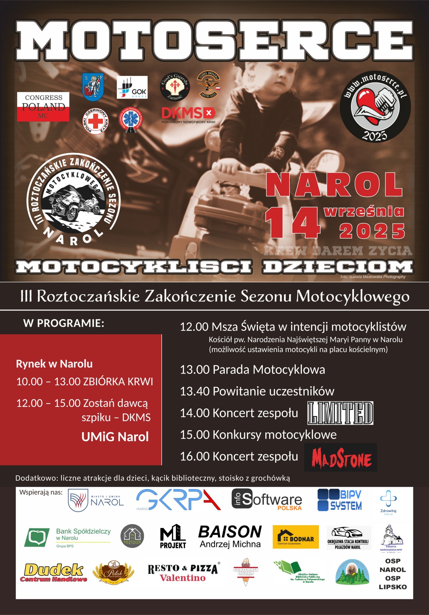 W programie nie zabraknie atrakcji dla całych rodzin. Od godziny 10:00 do 13:00 prowadzona będzie zbiórka krwi, a w godzinach 12:00–15:00 będzie można zarejestrować się jako potencjalny dawca szpiku w ramach akcji DKMS. O 12:00 w kościele pw. Narodzenia Najświętszej Maryi Panny odprawiona zostanie Msza Święta w intencji motocyklistów, po której o 13:00 uczestnicy wyruszą w Paradzie Motocyklowej. Od godziny 14:00 impreza nabierze muzycznego charakteru. Na scenie wystąpią zespoły Limited i MadStone, a wcześniej, o 15:00, publiczność będzie mogła podziwiać rywalizację w konkursach motocyklowych.