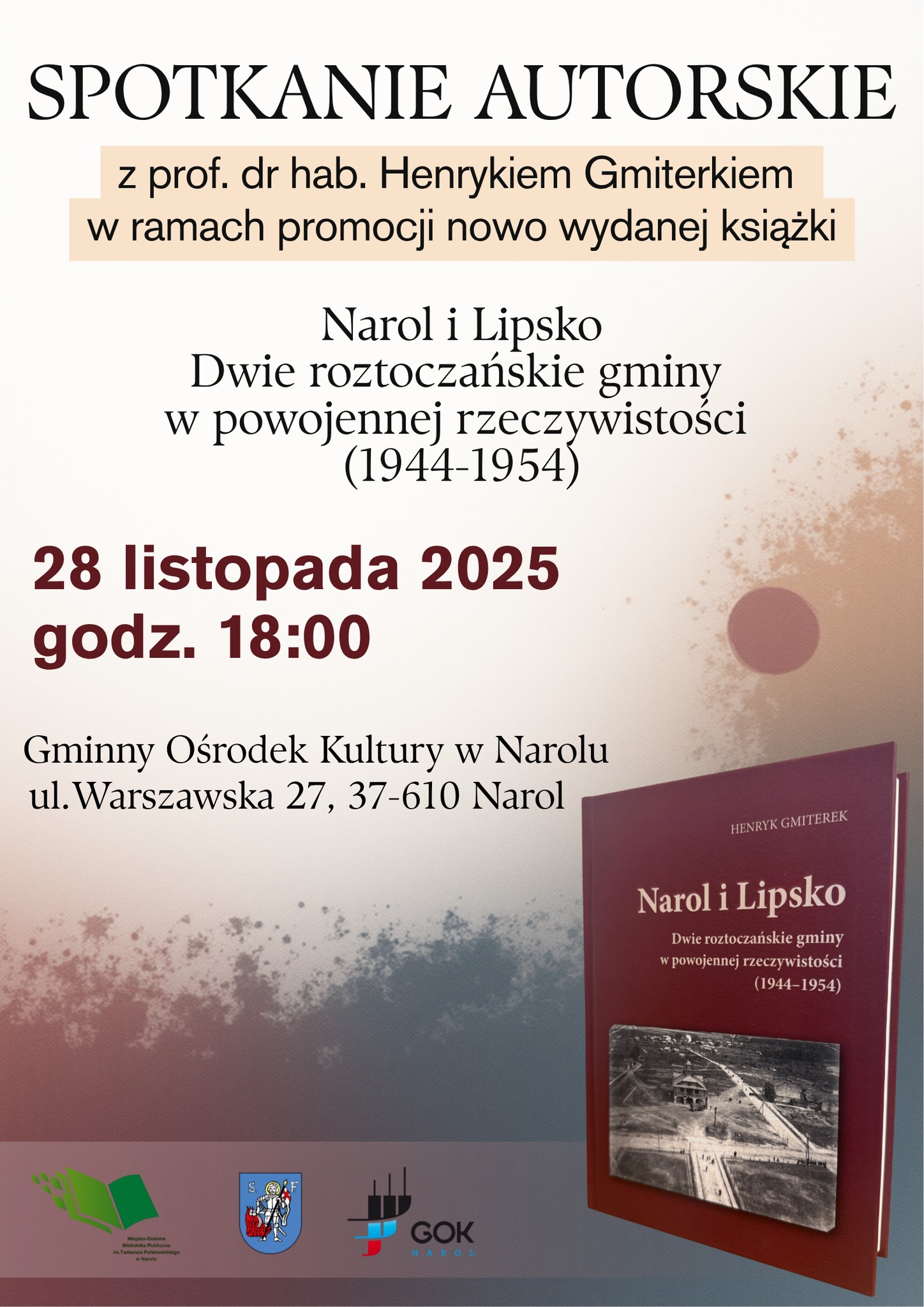 Gminny Ośrodek Kultury w Narolu zaprasza w niedzielę, 28 listopada o godz. 18:00, na spotkanie autorskie z prof. dr hab. Henrykiem Gmiterkiem. Wydarzenie związane jest z promocją jego najnowszej książki „Narol i Lipsko. Dwie roztoczańskie gminy w powojennej rzeczywistości (1944–1954)”.
